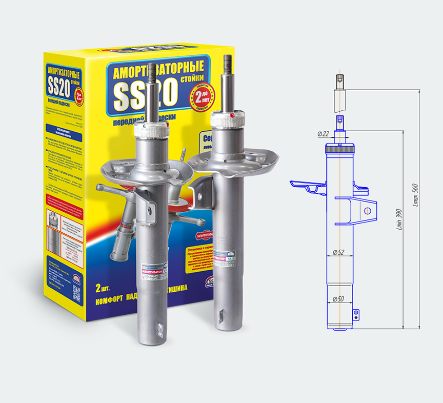 Передние амортизаторы SS20 имеют диаметр штока 22 мм и диаметр корпуса в районе соединения с поворотным кулаком 50 мм.