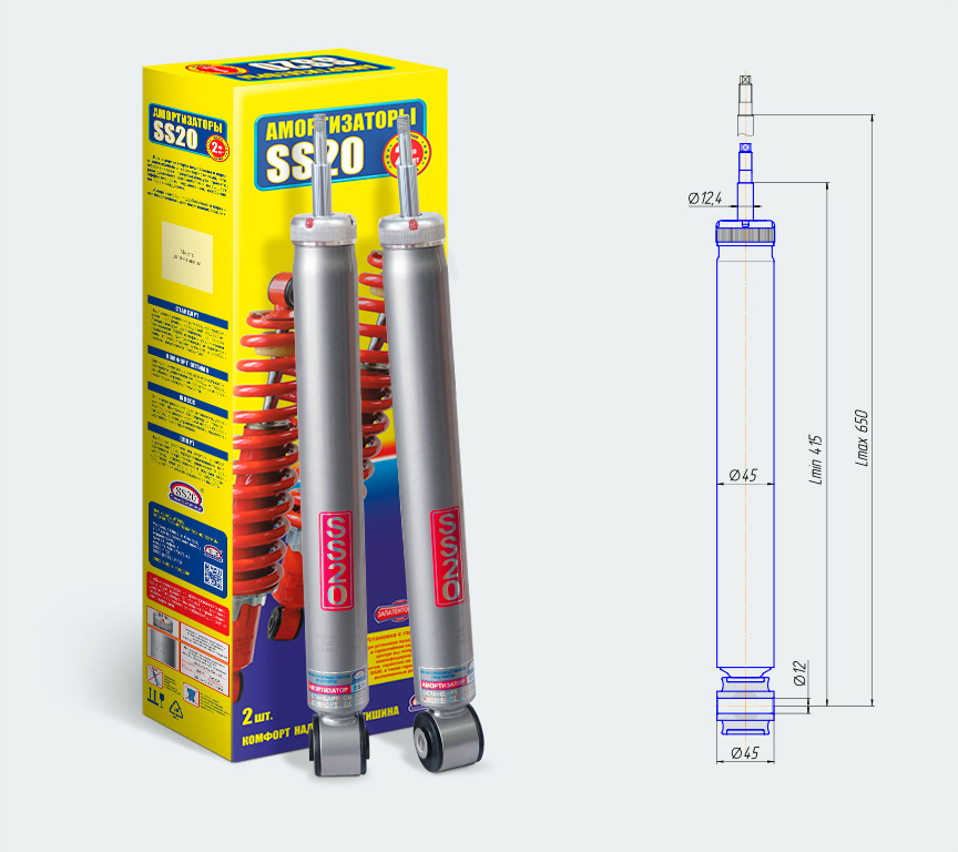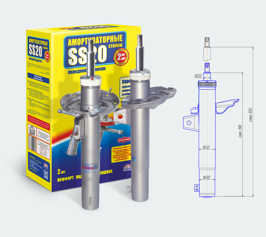 Передние амортизаторы SS20 имеют диаметр штока 22 мм и диаметр корпуса в районе соединения с поворотным кулаком 50 мм и устанавливаются на автомобили с объемом двигателя 1,2; 1,4 и 1,6 л
